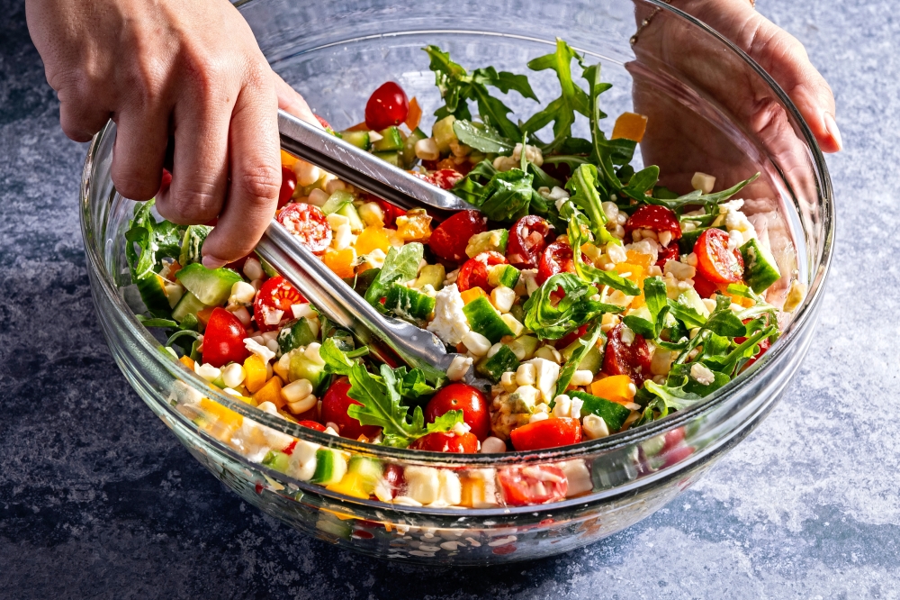 While the chicken is resting, in a large bowl, toss together the arugula, tomatoes, cucumbers, corn, bell pepper and feta until combined. Drizzle lightly with about half (1/4 cup) of the remaining dressing, and gently toss again to coat.