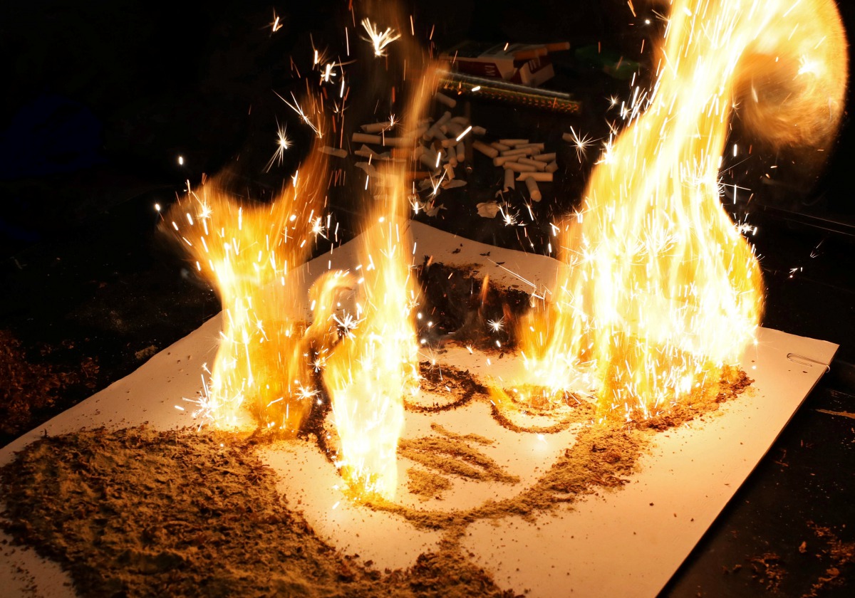 The cigarettes fuel his art; he breaks them in half, painstakingly traces out monochrome images of celebrities or animals with the fine flakes of tobacco, then sprinkles his creations with gunpowder and sets them on fire.