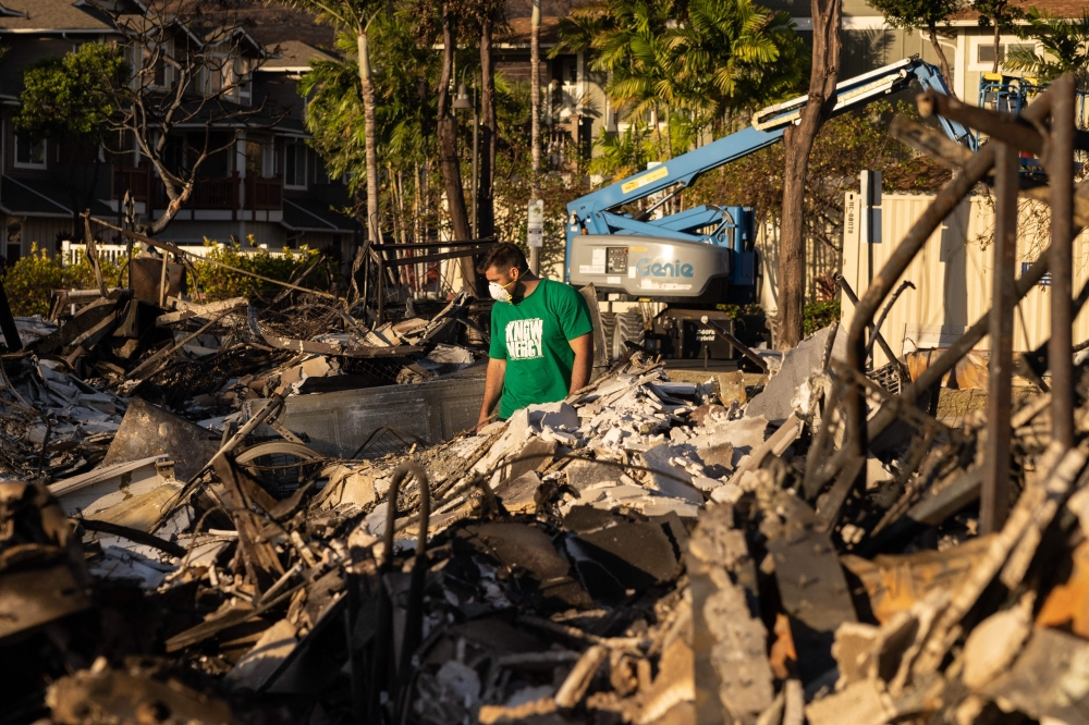 A Mercy Worldwide volunteer makes damage assessment of charred apartment complex in the aftermath of a wildfire in Lahaina, western Maui, Hawaii on August 12, 2023.
