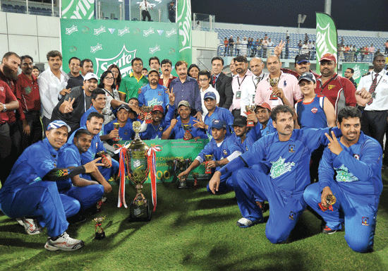 Qalco team, winners of the Sprite Cricket Stars Labour Tournament 2015, pose for a picture with Sprite officials and Gul Khan, Tournament Director of Qatar Cricket Association at Asian Cricket Town Stadium, Industrial Area on Thursday.Picture by: Abdul Basit