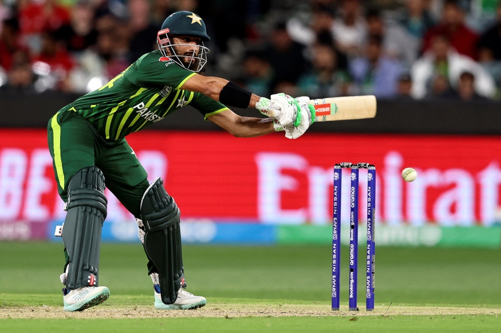 Pakistan's Shan Masood plays a shot during the ICC men's Twenty20 World Cup 2022 cricket final match between England and Pakistan at the Melbourne Cricket Ground (MCG) in Melbourn on November 13, 2022. (AFP/Martin Keep)
