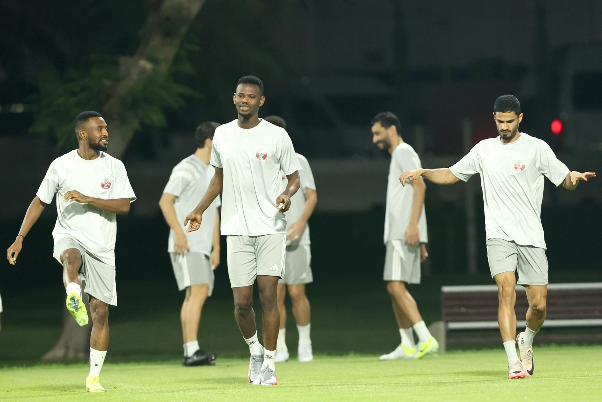 Qatar players take part in a training session in Doha yesterday as they gear up for the FIFA World Cup 2026 qualifier against Uzbekistan.
