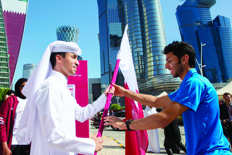 Qatar’s top squash player Abdulla Al Tamimi (right) handing over a flag to Jassim Rashid Al Buenain, Secretary-General of Qatar Olympic Committee (QOC), during the Mini Tour of Team Qatar’s Flag Relay at the QOC Headquarters in Doha, yesterday.