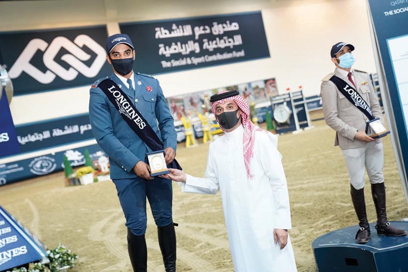 Haidan receiving the winner's trophy from Omar Al Mannai, Vice Chairman of the Organising Committee of Longines Hathab Qatar Equestrian Tour.