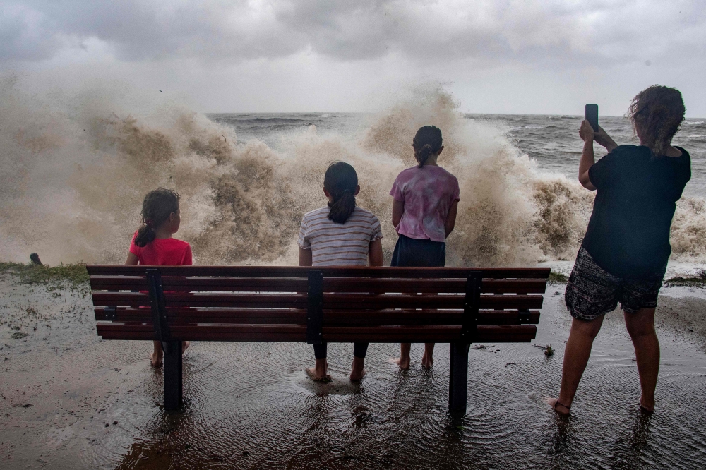 A family watch the storm roll in across the Coral Sea at Holloways Beach as Cyclone Jasper approaches landfall in Cairns in far north Queensland on December 13, 2023. Photo by Brian CASSEY / AFP