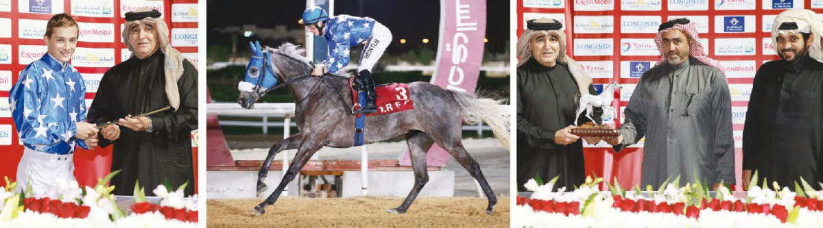 Jockey H Bentley receiving the trophy from Sheikh Nawaf bIn Nasser bin Khalid Al Thani during the 25th race meet at Qatar Racing and Equestrian Club (QREC) in Doha yesterday. Centre: Radwah, winner of Umm Taqa Cup in action at yesterday’s race. Right: Sheikh Nawaf bin Nasser bin Khalid Al Thani (left) receiving a memento from Sheikh Mohamed Bin Faleh Al Thani, Chairman of QREC.