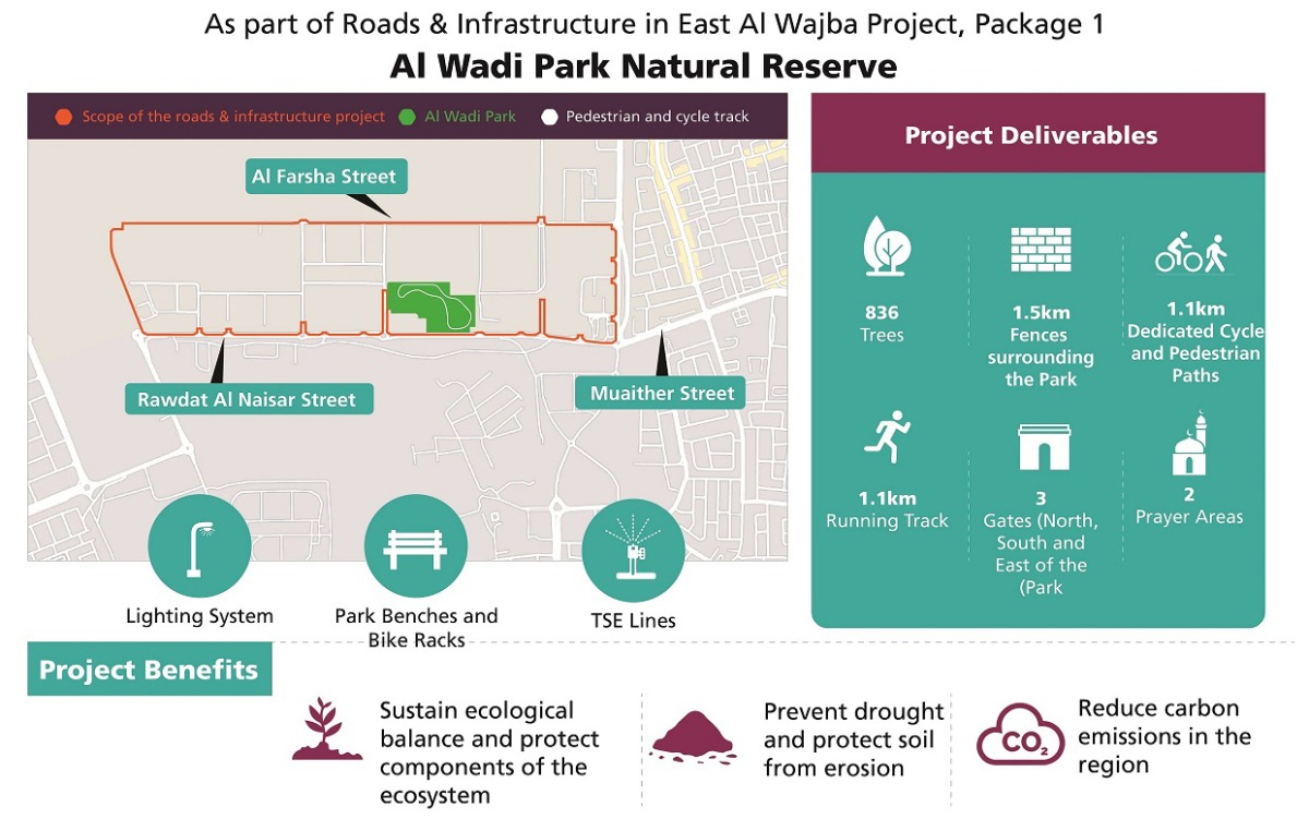 Al Wadi Park Natural Reserve project, in cooperation with the Supervisory Committee of Beautification of Roads and Public Places in Qatar, is part of the Roads and Infrastructure Project in Al Wajba East (Package 1), which the Public Works Authority ‘Ashghal’ began implementing in Q3 of 2020.