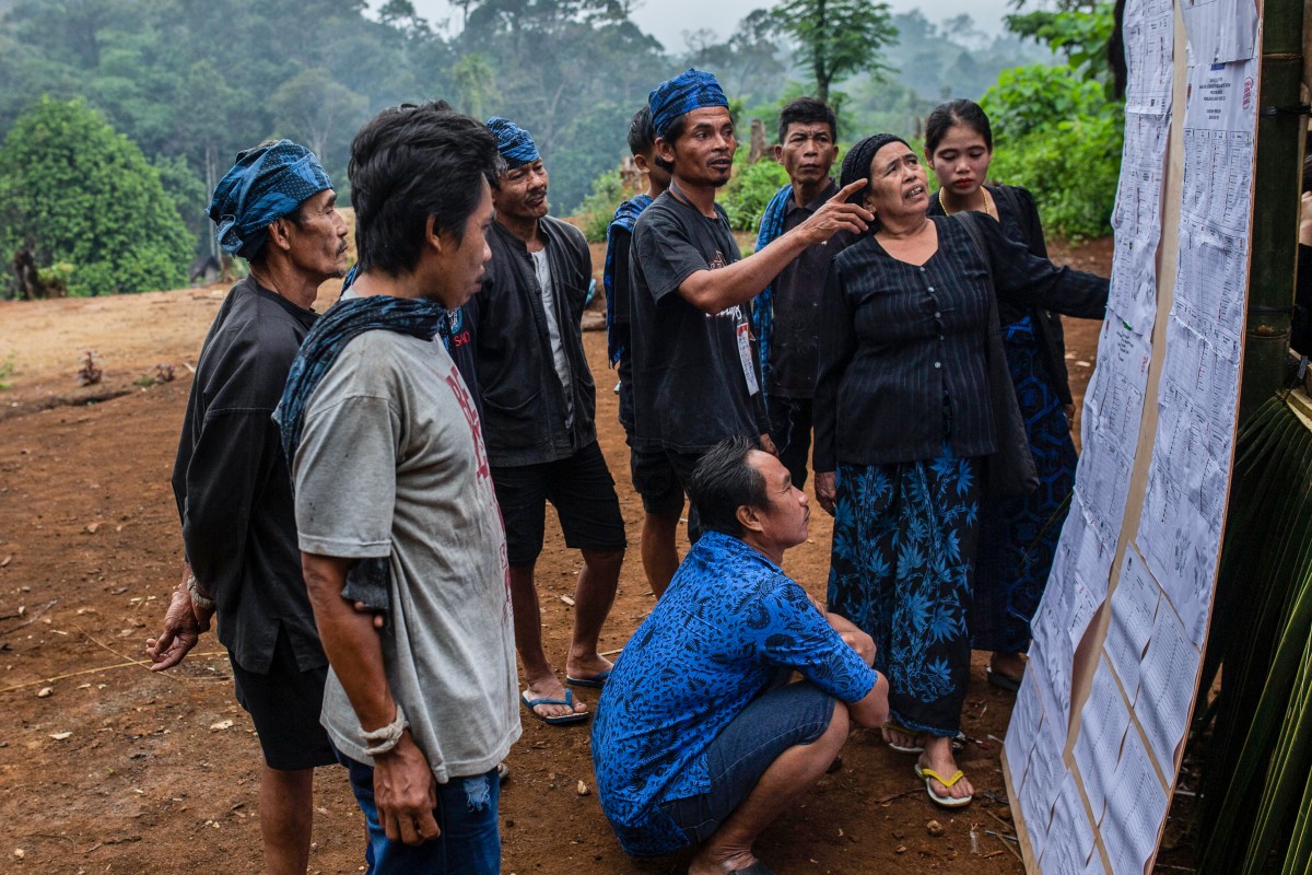 Members of the indigenous Baduy tribe check the candidates list at a polling station before they cast their ballots and vote in Indonesia’s presidential and legislative elections in Kanekes Village, Lebak, Banten province on February 14, 2024. Photo by ADITYA AJI / AFP