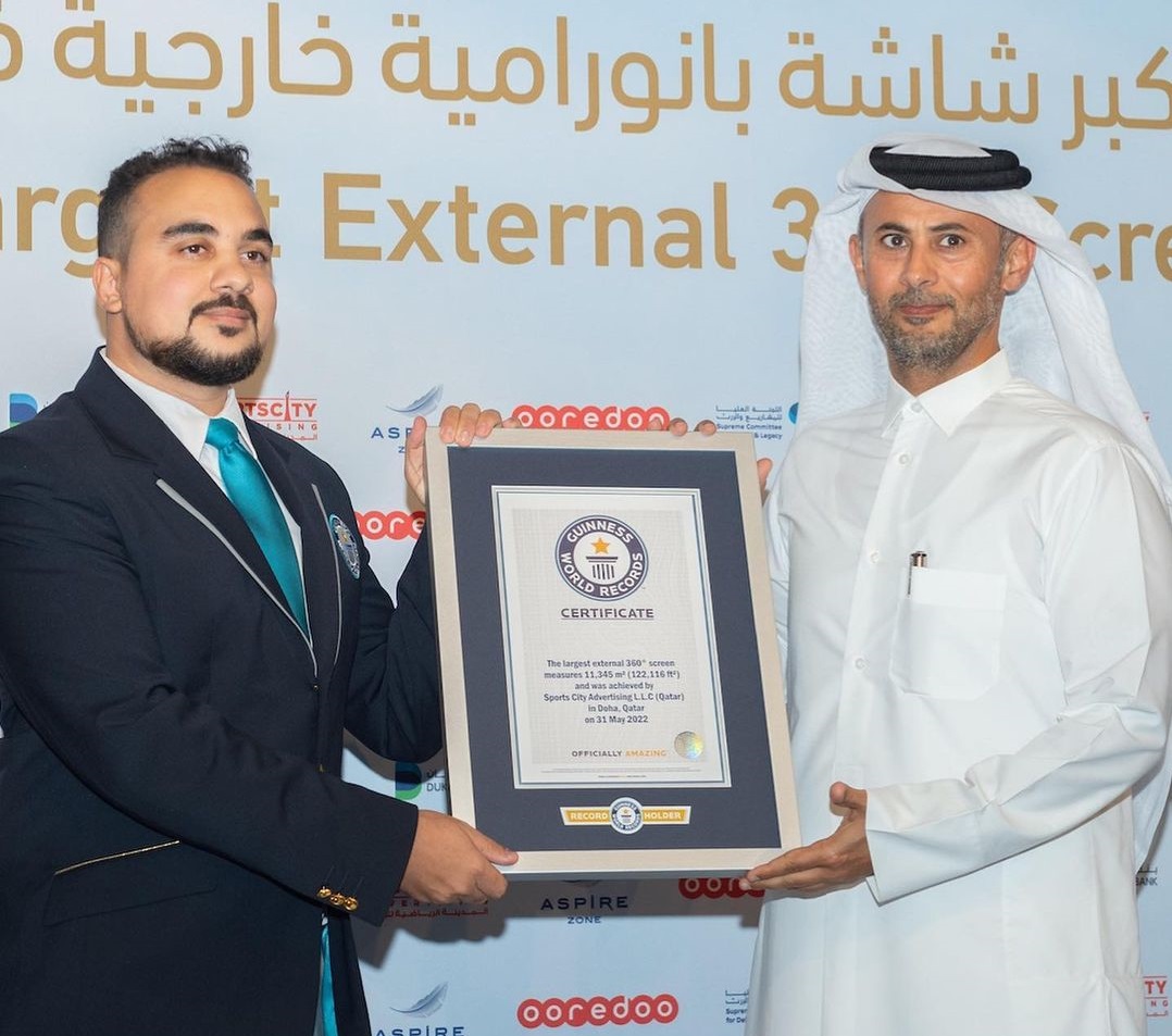 According to the Guinness World Records website: “The largest external 360 screen measured 11,345m² (112,116 ft² 81 in²), and was achieved by Sports City Advertising (Qatar), in Doha, Qatar on May 31, 2022. Sports City Advertising attempted this record to showcase the Torch Building that has the screen all around it. The Torch, also known as the Aspire Tower, has a total height of 298m (980ft), located in Doha.”