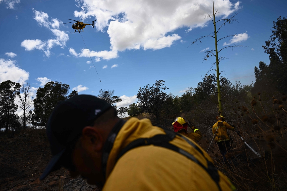 A firefighting helicopter drops supplies as Maui County firefighters extinguish a fire near homes during the upcountry Maui wildfires in Kula, Hawaii on August 13, 2023.