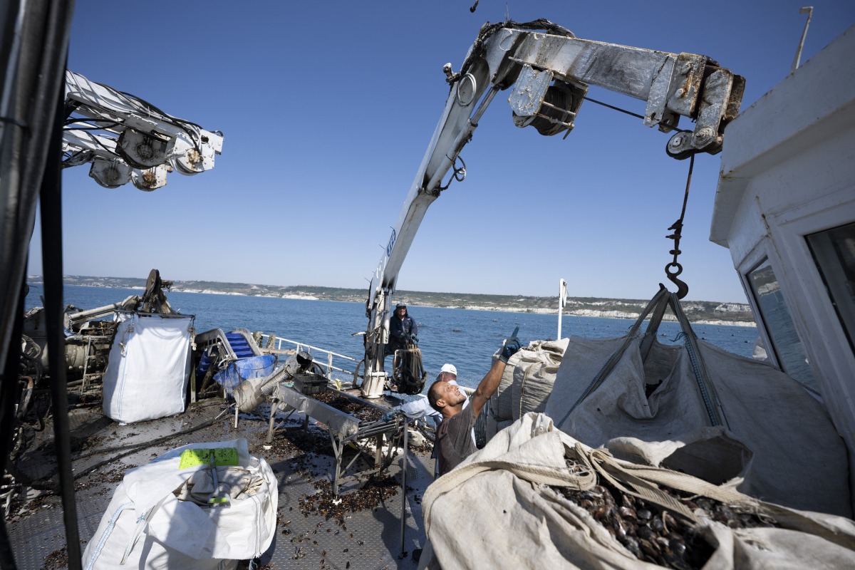 Together with his six employees, Bulgaria pioneer Stanev is on deck at dawn to harvest and deliver his mussels, with the season reaching its peak at the end of August.