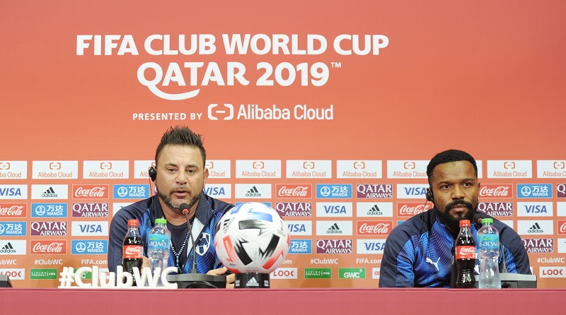 Monterrey manager Antonio Mohamed (left) speaks during a pre-match press conference in Doha on the eve of today’s FIFA Club World Cup quarter-final match against Al Sadd.