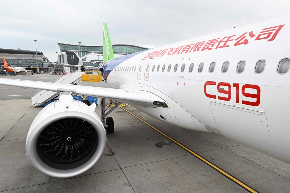 China's domestically produced C919 passenger jet is seen on display at Hong Kong International Airport on December 13, 2023. (Photo by Peter Parks / AFP)