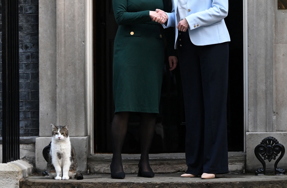(Files) Larry looks on as Britain's PM Liz Truss (C) and Danish PM Mette Frederiksen (R) pose in central London on October 1, 2022. (Photo by Justin Tallis / AFP)