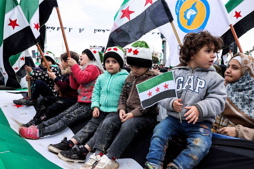 Children attend a rally marking the 12th anniversary of the start of the uprising against Syrian President Bashar al-Assad and his government, in the rebel-held northwestern city of Idlib on March 15, 2023. (Photo by OMAR HAJ KADOUR / AFP)