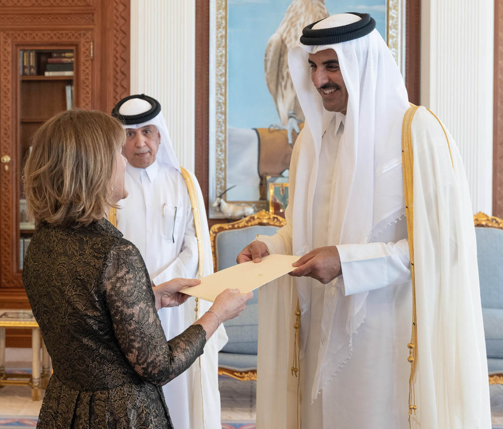 His Highness the Amir received the credentials of Ambassador of the Republic of Chad HE Dausa Idriss Deby Itno, Ambassador to the Republic of Niger HE Abdulkarim Soumana, Ambassador of the People’s Democratic Republic of Algeria HE Salah Attia, Ambassador of the Republic of Ireland H E Alison Milton, Ambassador of the Republic of Slovenia HE Natalia Al Mansour, and Ambassador of the Republic of Fiji HE Naipote Tako Katonitabua.