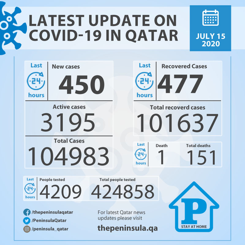 Ministry of Public Health today recorded 450 new cases of coronavirus (COVID-19) and 477 people recovered from the virus in the last 24 hours, bringing the total number of people recovered in Qatar to 101637. The Ministry also announced one death due to Covid-19.