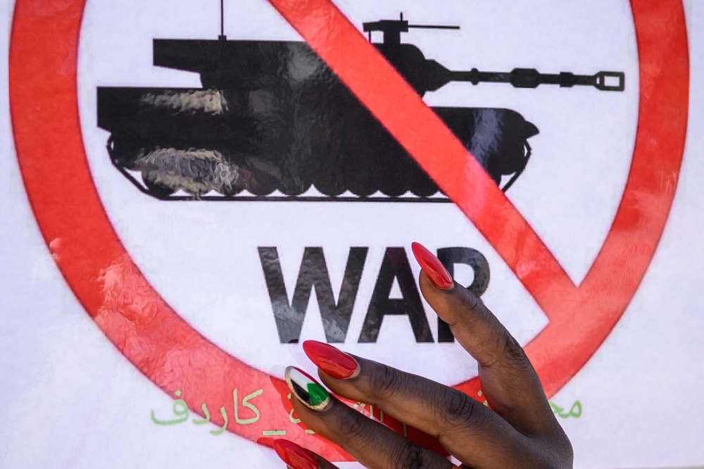 A woman with one of her painted nail adorned with a Sudanese flag holds a placard during a demonstration on the opening day of Sudan ceasefire talks, in Geneva, on August 14, 2024. (Photo by Fabrice COFFRINI / AFP)