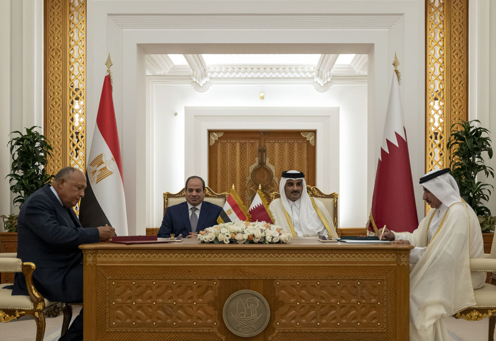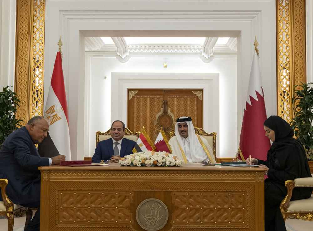 Amir H H Sheikh Tamim bin Hamad Al Thani and President of the Arab Republic of Egypt H E Abdel Fattah El Sisi witnessing signing of memoranda of understandings between the governments of the two countries at the Amiri Diwan, yesterday.