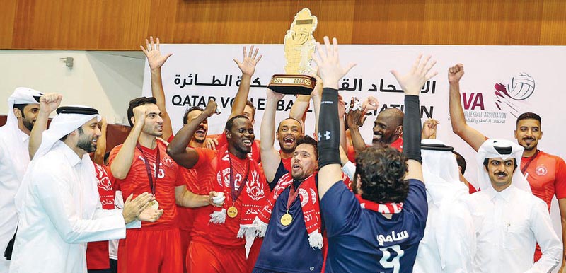 Al Arabi's players and officials celebrate after defeating Al Ahli 3-1 in the final of Qatar Cup Volleyball at Qatar Volleyball Association (QVA) Hall, yesterday.
