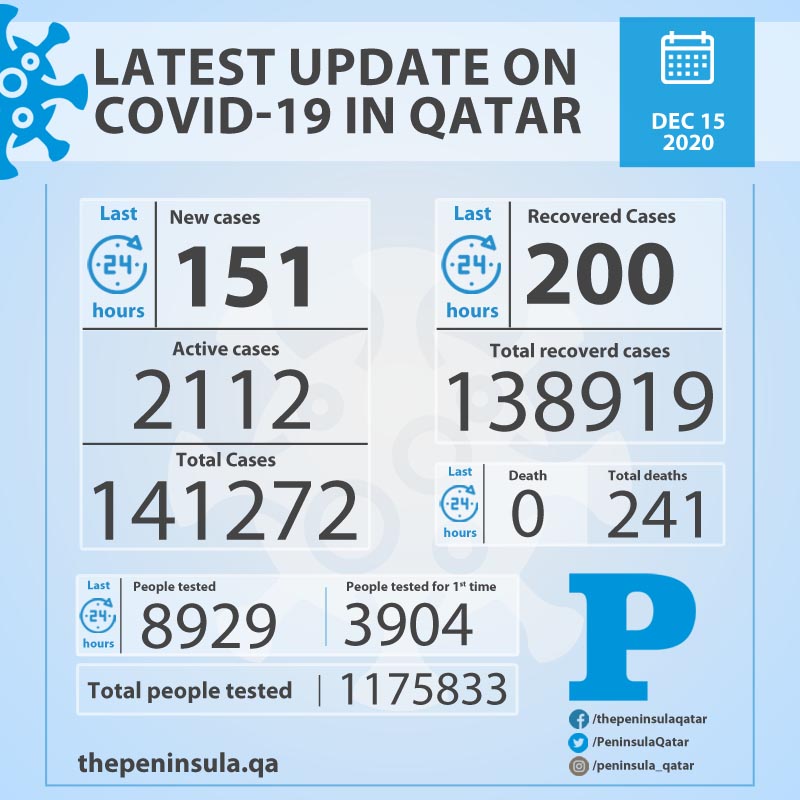 Doha: Ministry of Public Health (MoPH) today recorded 151 new cases of coronavirus (COVID-19) and 200 people recovered from the virus in the last 24 hours, bringing the total number of people recovered in Qatar to 138,919.