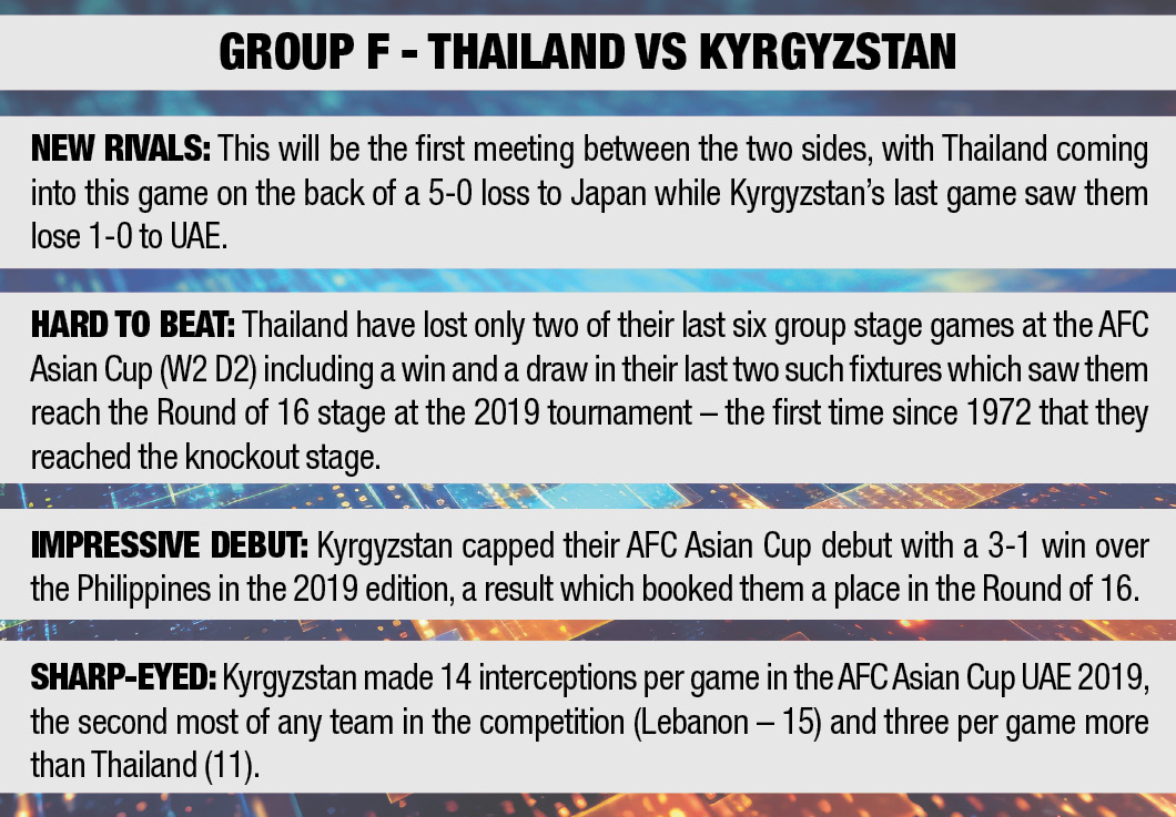 Ranked 15 places higher than Thailand in the FIFA World Ranking, the onus is on Kyrgyzstan to set the tone with an opening win to boost confidence ahead of meetings with Saudi Arabia (Jan 21) and Oman (Jan 25).