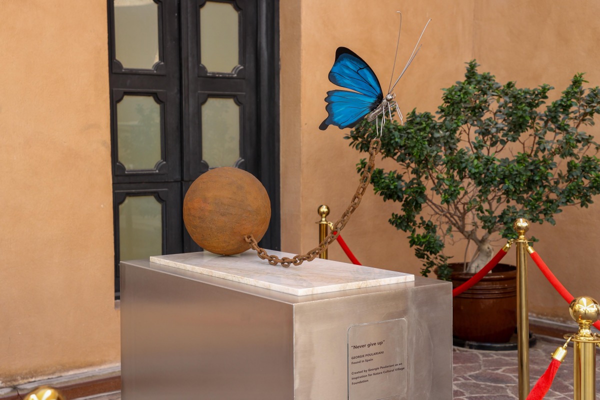 On lessons he wants people to learn from his piece of art, Poulariani said, “I want people to see that challenges and hardships, symbolized by the heavy chain and ball, are part of life, but they do not define us. The butterfly represents transformation, hope, and the courage to break free from limitations.”