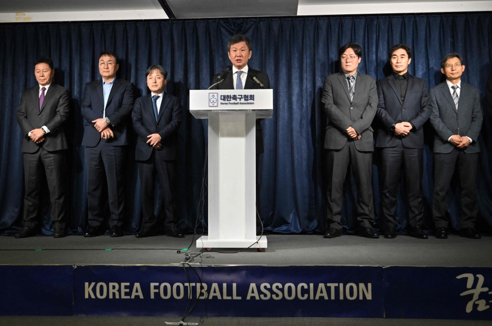 Chung Mong-gyu (C), president of the Korea Football Association (KFA), speaks at a briefing after a meeting with senior executives to determine Jurgen Klinsmann's fate as the national team head coach, at the KFA headquarters in Seoul on February 16, 2024. Photo by Jung Yeon-je / AFP