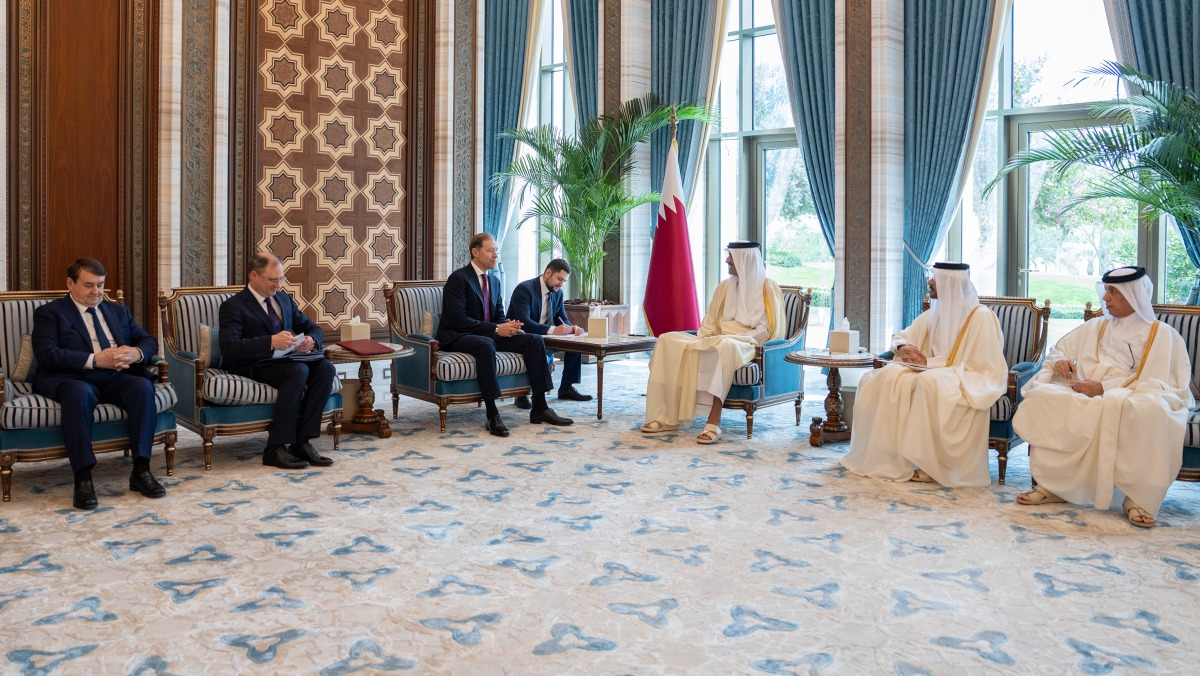 Doha, Qatar: The Amir His Highness Sheikh Tamim bin Hamad Al Thani received at his office at Lusail Palace this morning HE Denis Manturov, First Deputy Prime Minister of the Russian Federation, and his accompanying delegation.