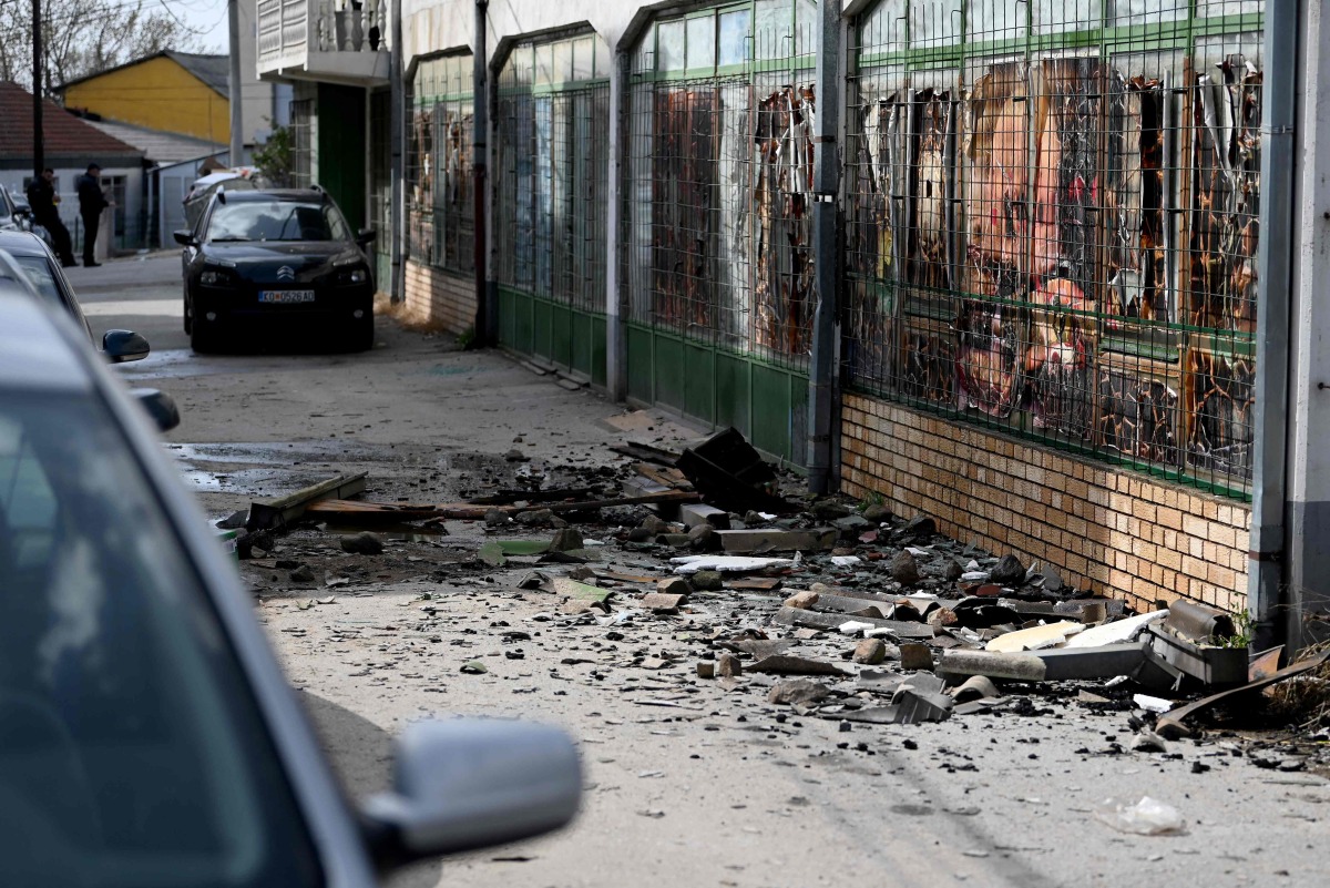 Debris lies on the pavement outside the burnt down establishment in which revellers died, in Kocani, a town some 100 kilometres east of the capital Skopje, on March 16, 2025. Photo by Stringer/ AFP