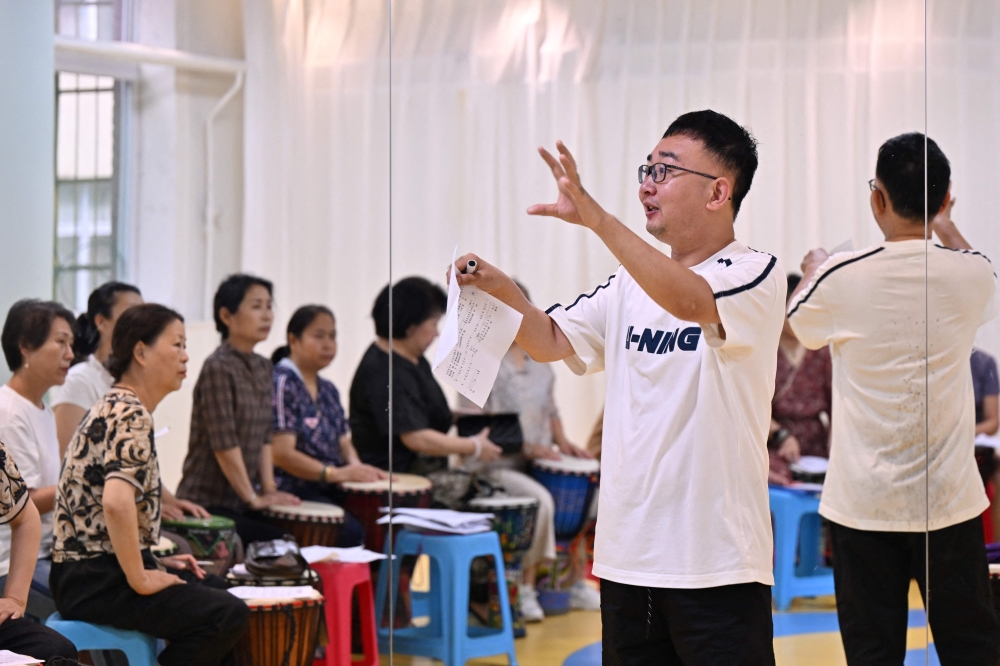 Lei Fangyan (R) gesturing as he teaches African drums at a kindergarten-turned-elderly centre in Taiyuan, in China's northern Shanxi province. (Photo by Adek Berry / AFP)