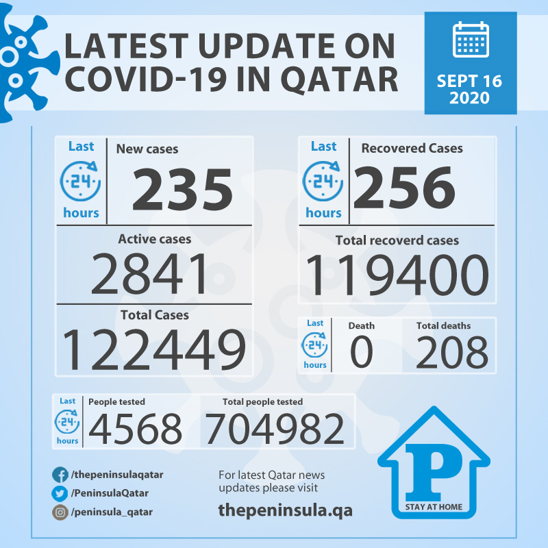 Doha: Ministry of Public Health (MoPH) today recorded 235 new cases of coronavirus (COVID-19) and 256 people recovered from the virus in the last 24 hours, bringing the total number of people recovered in Qatar to 119,400.