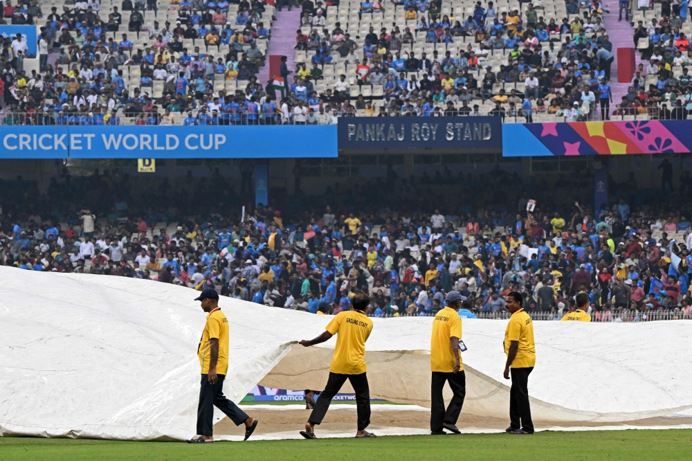 Members of ground staff cover the pitch as rain stops the play at the Eden Gardens in Kolkata on November 16, 2023. (Photo by Dibyangshu Sarkar / AFP)
