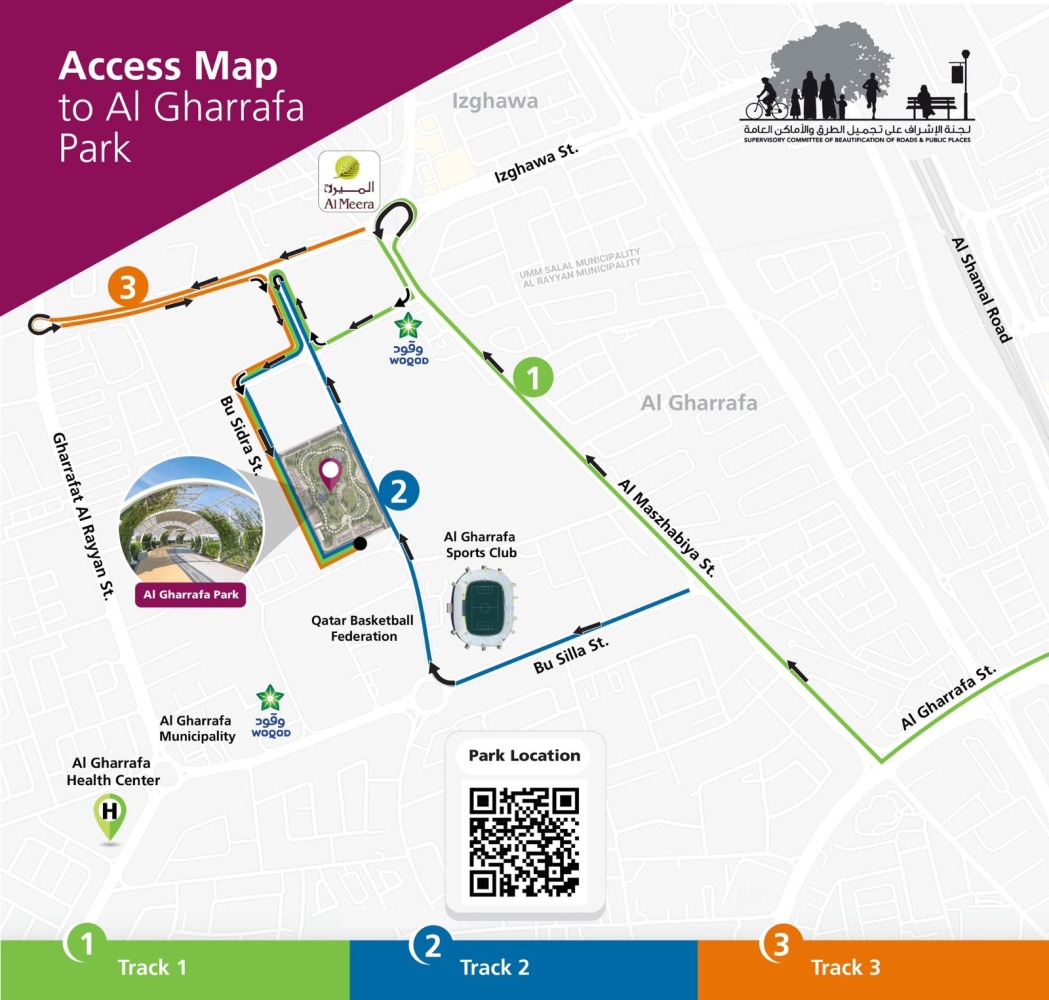 Eng Yousef Abdul Rahman Al Emadi, Director of Projects Affairs at Ashghal said that Al-Gharafa Park is distinguished as a central park such as Rawdat Al-Hamamam Park, Rawdat Al-Khail Park and Umm Al-Seneem Park, serving many areas, besides providing vast green spaces. It also provides various facilities that serve all visitors, such as the first ever air-conditioned tracks for pedestrians and joggers, and another path for cyclists, kids play areas, facilities for people with special needs, yards for economic activities, besides provision of vast green spaces.