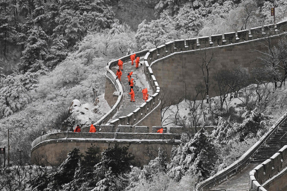 Defying the already frosty weather, tourists in Beijing braved biting winds Friday at the portion of the Great Wall located in the mountains surrounding the city, where the iconic monument sat covered in a thin layer of snow.