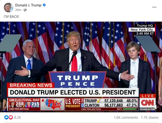 Attached to the post was a 12-second video clip from his 2016 election night victory speech, showing Trump standing alongside his then-Vice President-elect Mike Pence, and Trump's youngest son, Barron.