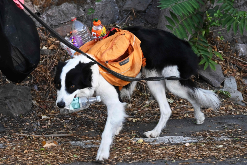 Sam, the dog of sportsman and lawyer Gonzalo Chiang, picks up a plastic bottle during a plog run at Cerro San Cristobal in Santiago, on March 12, 2024. Photo by RODRIGO ARANGUA / AFP