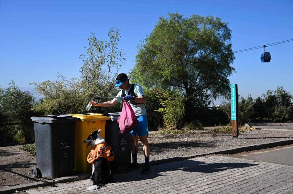 Sportsman and lawyer Gonzalo Chiang accompanied by his pet Sam, puts plastic bottles into a recycle bin during a plog run at Cerro San Cristobal in Santiago, on March 12, 2024. Photo by RODRIGO ARANGUA / AFP​​​​​​​