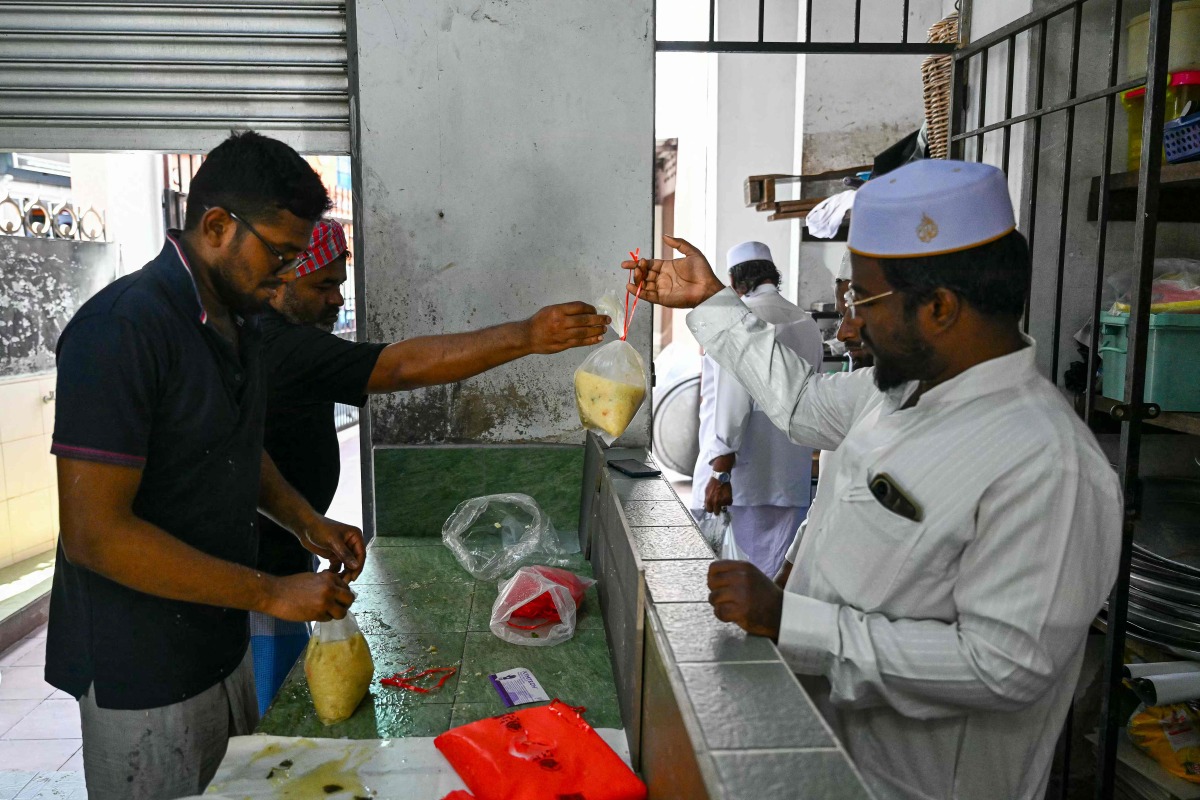 This picture taken on March 7, 2025 shows a Muslim man (R) carrying a packet of popular dish 'Bubur Lambuk' as other queue outside the Masjid India during the Muslim holy fasting month of Ramadan in Kuala Lumpur. (Photo by Mohd RASFAN / AFP)