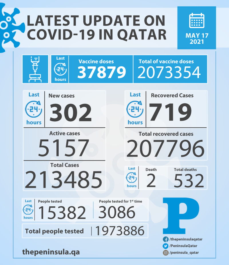 Doha: Ministry of Public Health (MoPH) today reported 302 new cases of coronavirus (Covid-19) and 719 people recovered from the virus in the last 24 hours, bringing the total number of people recovered in Qatar to 207,796.