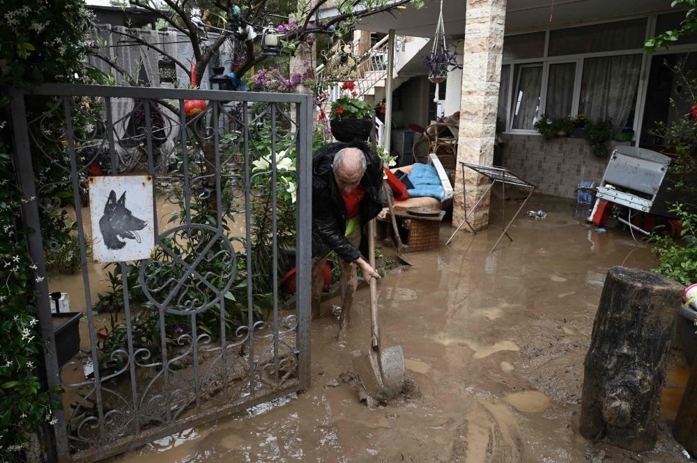 A man removes mud from his house following floods caused by overnight heavy rainfall in Thessaloniki on June 17, 2023. (Photo by Sakis MITROLIDIS / AFP)