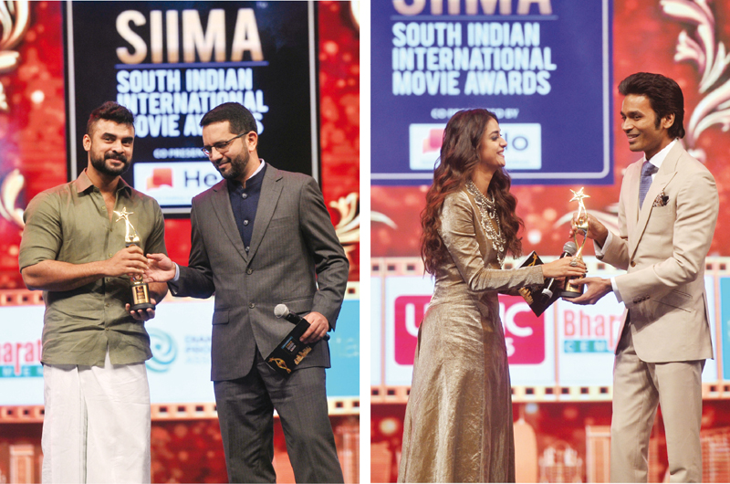 Tovino Thomas (left), with Pantaloons SIIMA 2019 Best Actor Malayalam Award and Best Actor Tamil award was won by Danush for his performance in ‘Vada Chennai’