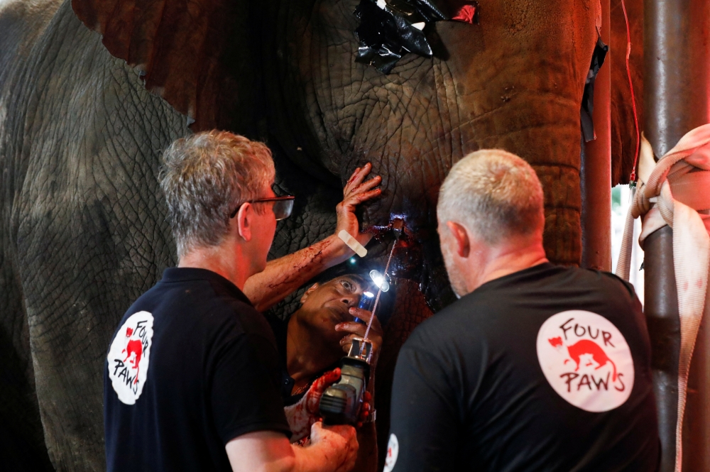 Vets and animal experts from the FOUR PAWS International, perform dental procedure of a 16 year-old elephant, Madhubala, at the zoo in Karachi, Pakistan, August 17, 2022. (REUTERS/Akhtar Soomro)