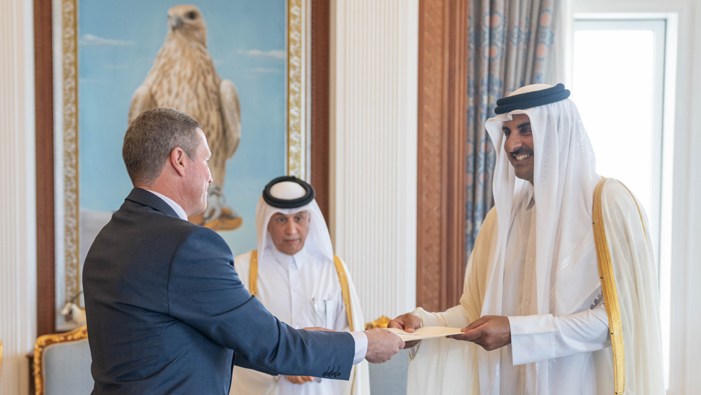The Amir received the credentials of H E Farhad Khalif, Ambassador of the sisterly Republic of Tunisia; H E Lothar Freischlader, Ambassador of the Federal Republic of Germany; H E Vipul, Ambassador of the Republic of India; H E Shane Flanagan, Ambassador of Australia; and H E Myratgeldi Seyitmammedov, Ambassador of Turkmenistan.