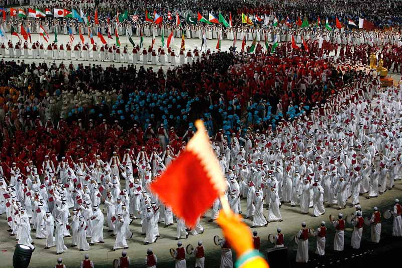 Athletes of Qatar parade into the stadium during the Opening Ceremony of the 15th Asian Games Doha 2006 at the Khalifa International Stadium in this December 1, 2006 file photo.