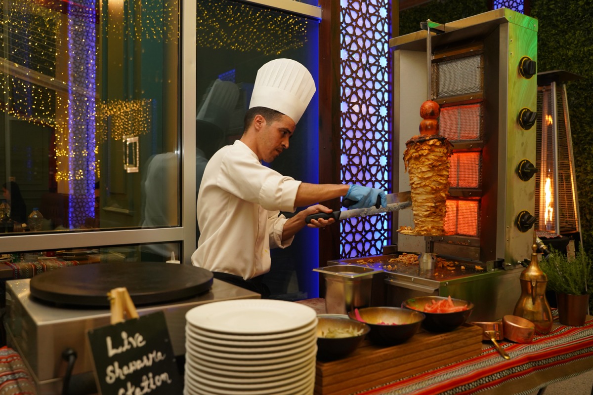 The Iftar buffet reflects the essence of Ramadan through menu changes and a balanced spread of main courses, salads, sweets, and international flavours. Main highlights include a lamb ouzi station and a live shawarma station, where freshly prepared dishes add aroma and vibrancy to the dining experience. The evening concludes with a colorful dessert selection, featuring cakes, traditional sweets, and a striking display of crescent moon–styled dates at the dessert counter. Suhoor preparations are also available upon request, offering added convenience for guests observing the holy month.