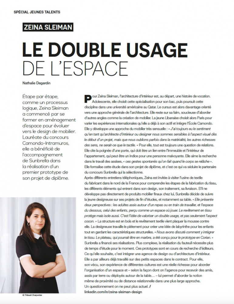 The magazine – for the first time – had organized a collaborative competition with École Camondo, the interior architecture and design school in Paris where Zeina was a postgraduate student from 2018 to 2020, Sunbrella, a company specializing in performance fabric for indoor & outdoor requirements, Moore Design, a design business renowned for developing workspace solutions in multiple sectors, and Lafuma, a French-based specialist in outdoor equipment and clothing.
