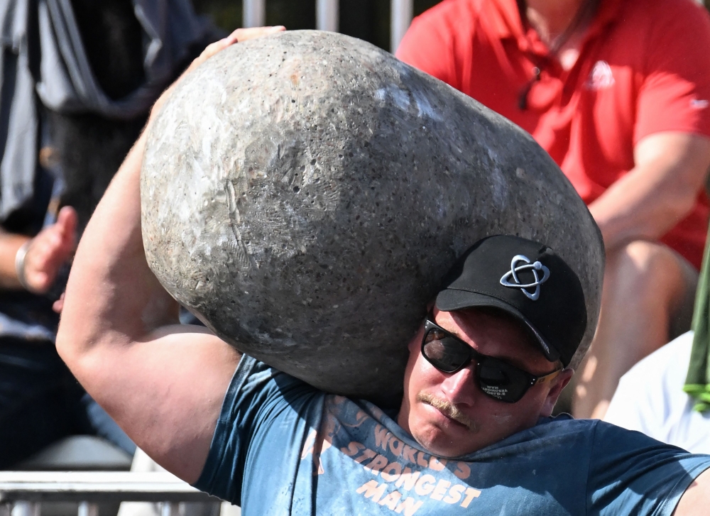 Rayno Nel of South Africa performs the stone to shoulder press during the qualifying round on May 16, 2025 in Sacramento, California. (Photo by Robyn Beck / AFP)