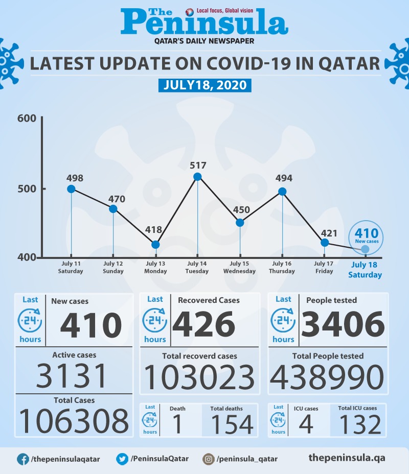 Ministry of Public Health today recorded 410 new cases of coronavirus (COVID-19) and 426 people recovered from the virus in the last 24 hours, bringing the total number of people recovered in Qatar to 103023. The Ministry also announced one death due to Covid-19.
