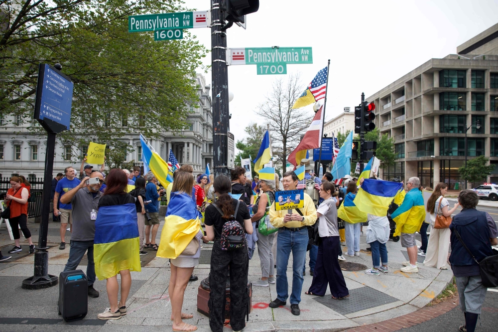 Ukraine supporters participate in a rally outside of the Eisenhower Executive Office Building near the White House ahead of the meeting between Ukrainian President Volodymyr Zelensky, European leaders and US President Donald Trump in Washington, DC, on August 18, 2025. (Photo by Amid Farahi / AFP)